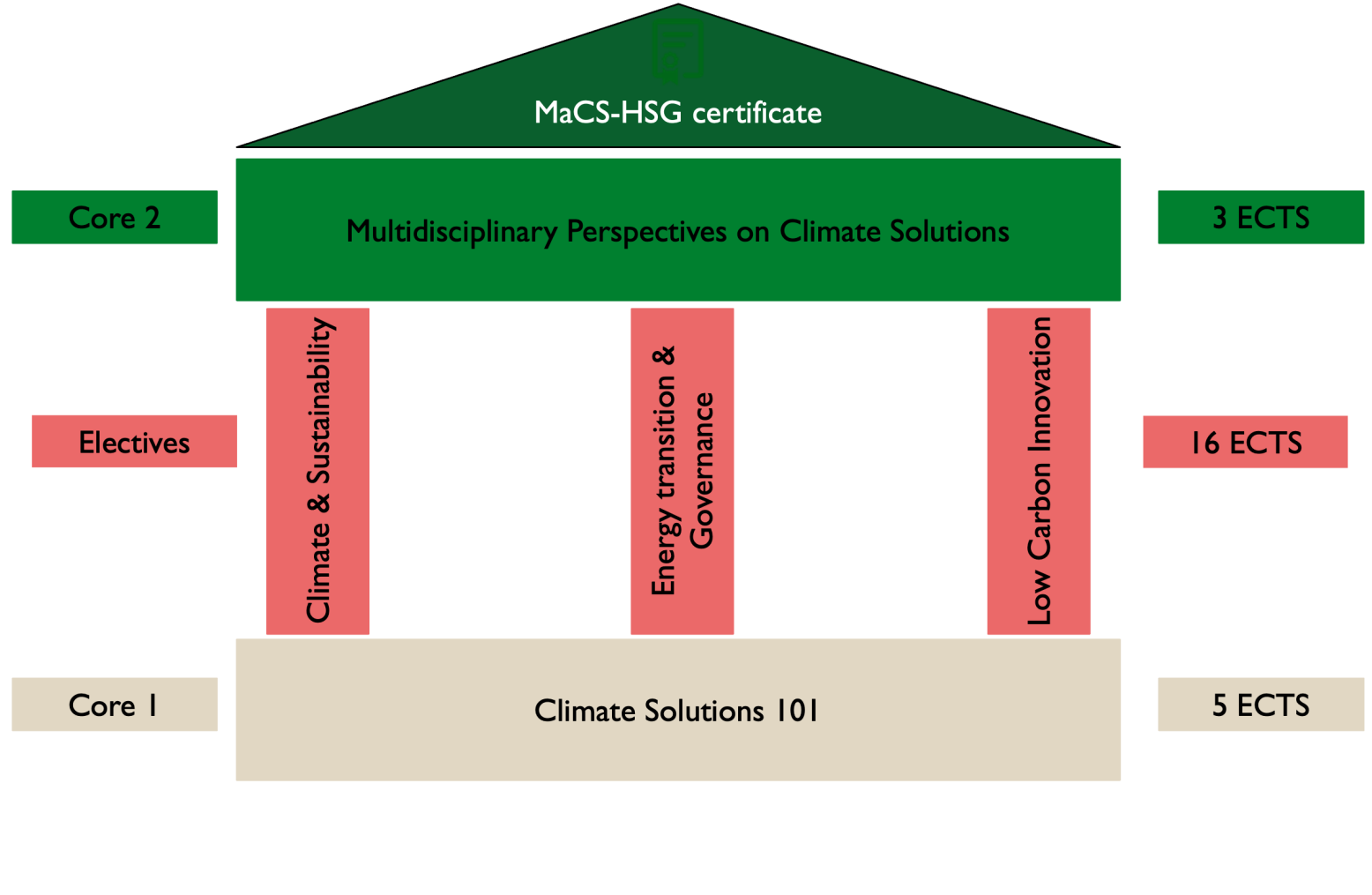 A set of elective courses can be selected from the three core areas (1) Climate and Sustainability, (2) Energy Transition & Governance, and (3) Low Carbon Innovation.