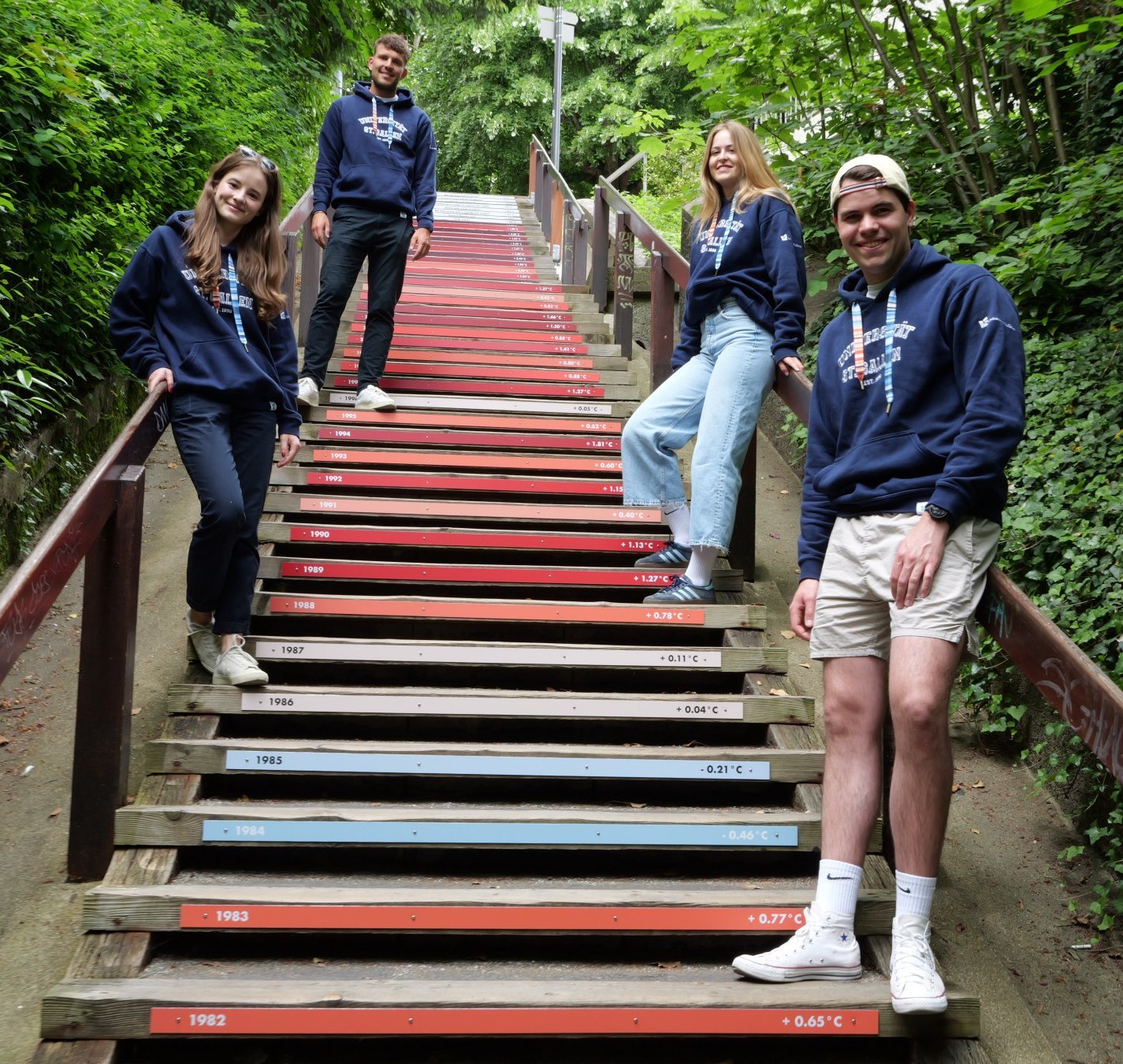 St. Gallen, the city of stairs. Many students at the University of St. Gallen face the daily challenge of climbing the stairs of Dohlengässlein. With each step, body temperature rises, and by the last step, heads glow in a reddish hue. Similarly, the climate warms year by year, in Switzerland even twice as fast as globally. That's why the team wanted to clad the staircase steps in the colors of the Climate Stripes, drawing attention to the problematic effects of climate warming for the local population and students.